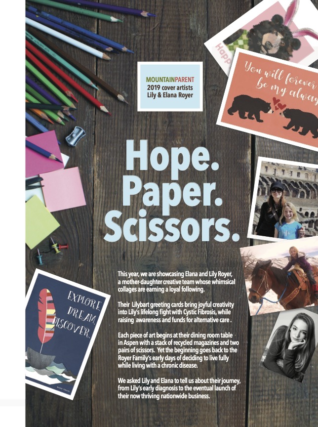 “Meet Elana and Lily Royer, a mother-daughter creative team whose whimsical collages are earning a loyal following. Their Lilybart greeting cards bring joyful creativity into Lily’s lifelong fight with Cystic Fibrosis while raising awareness and funds for alternative care. Each piece of art begins at their dining room table in Aspen with a stack of recycled magazines and two pairs of scissors. Yet the beginning goes back to the Royer Family’s early days of deciding to live fully while living with a chronic disease.